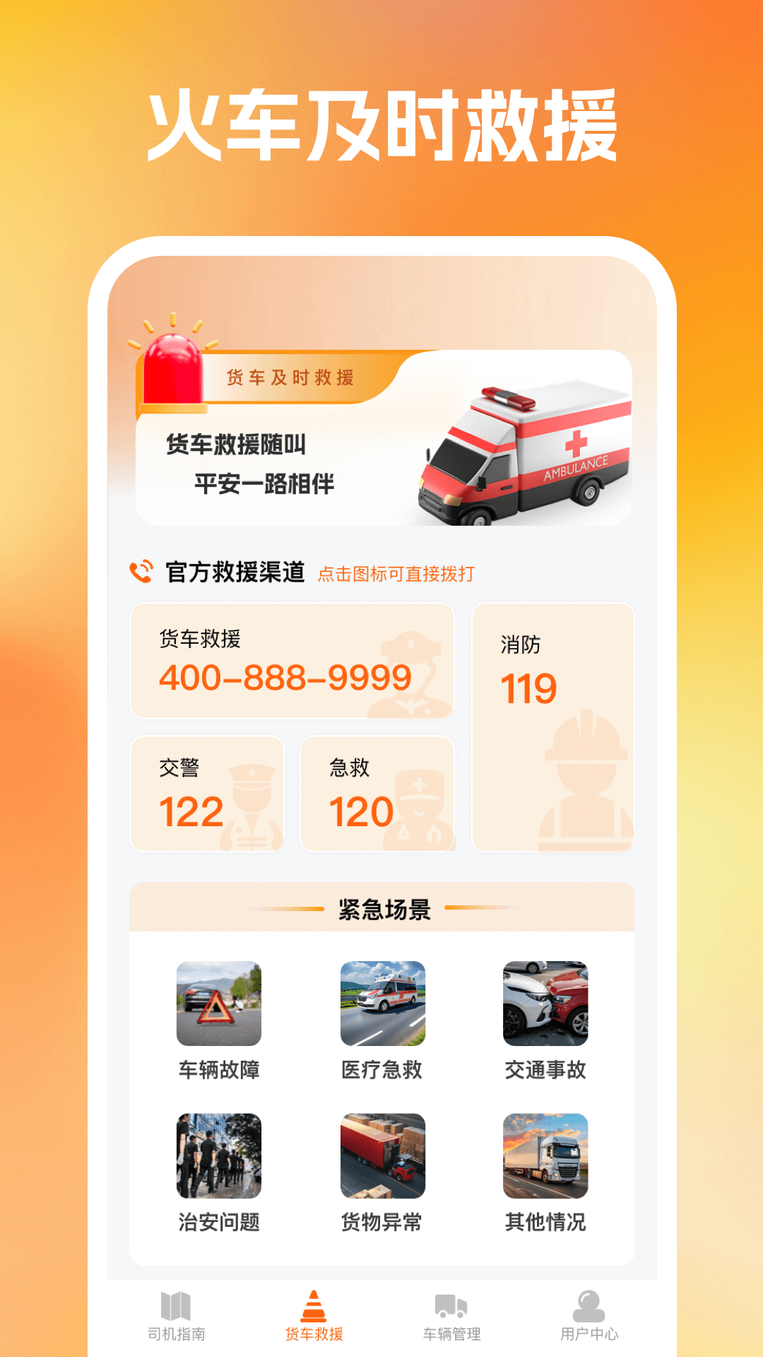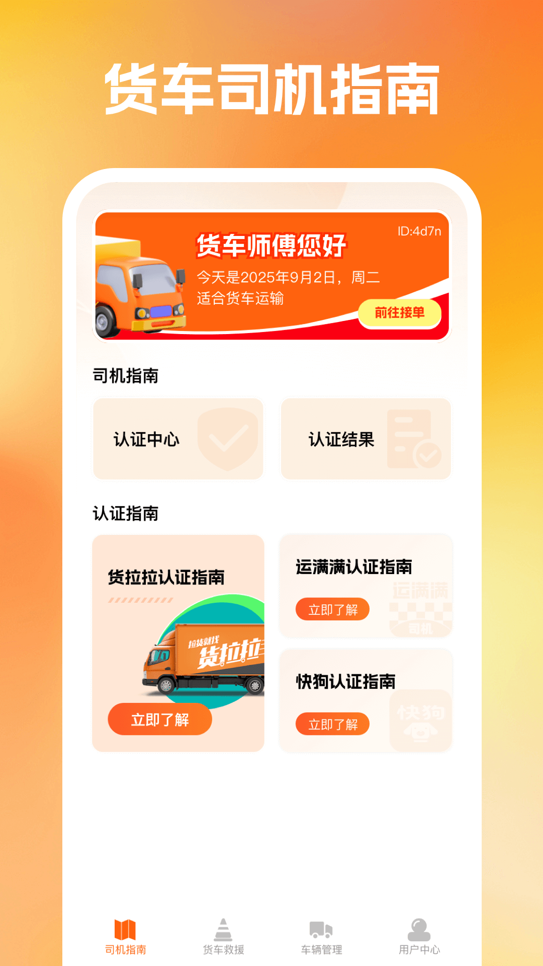 应用功能包含 司机指南,涵盖司机认证功能,会返回认证结果,还有认证指南供用户查看;货车救援提供了一些基本的官方救援渠道当货车司机遇到紧急情况时可以点击拨打救援电话,还包含基本紧急场景的应对手册,详细讲解了遇到相应的紧急情况可以如何应对应该拨打哪一个救援电话